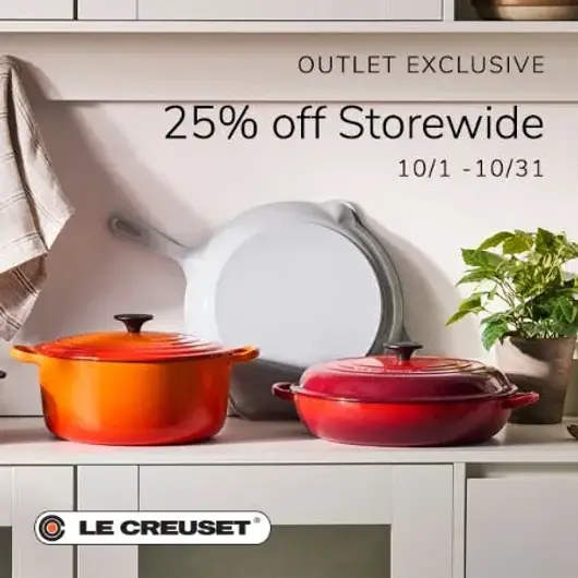 Storewide Savings valid October 1st – October 31st, 2025, at participating U.S. Le Creuset Outlet Stores. Not valid at Le Creuset Signature Boutiques or online.
