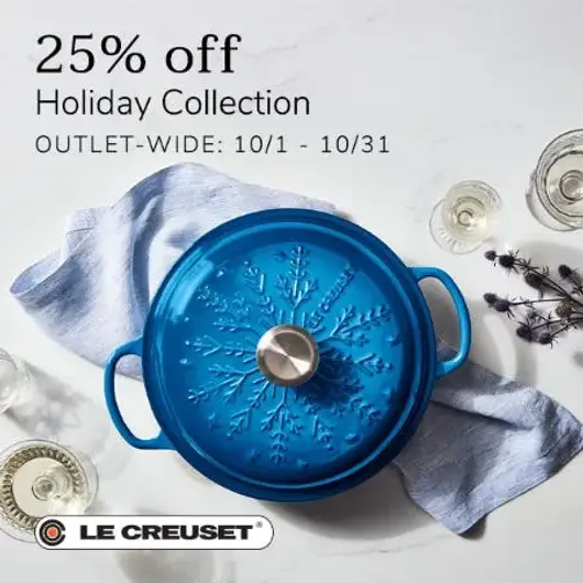 Holiday Collection savings valid October 1st – October 31st, 2025, at participating U.S. Le Creuset Outlet Stores, while supplies last. Not available online or at Le Creuset Signature Boutiques. Some exclusions may apply.
