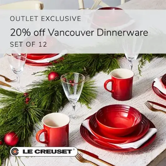 Vancouver Dinnerware Set of 12 savings valid October 1st – October 31st, 2025, at all participating U.S. Le Creuset Outlet Stores. Not available online or at Le Creuset Signature Boutiques.
