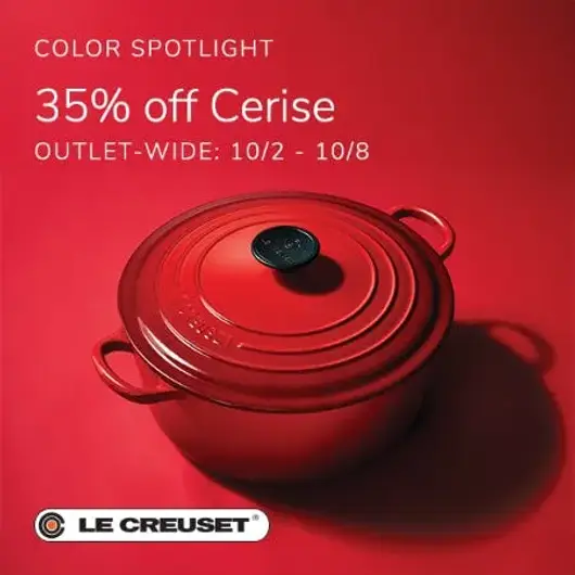 Cerise savings valid October 2nd – October 8th, 2025, at all participating U.S. Le Creuset Outlets, while supplies last.