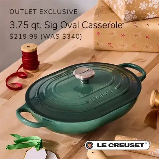 3.75 qt. Signature Oval Casserole savings valid October 1st – October 31st, 2025, at all participating U.S. Le Creuset Outlets. Savings cannot be combined with any other coupons or discounts, while supplies last.