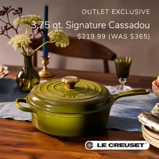 3.75 qt. Signature Cassadou savings valid October 1st – October 31st, 2025, at all participating U.S. Le Creuset Outlets. Savings cannot be combined with any other coupons or discounts, while supplies last.