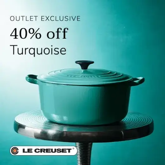 Turquoise savings valid October 1st – October 31st, 2025, at participating U.S. Le Creuset Outlets, while supplies last.