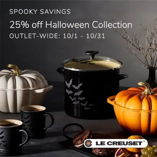 Halloween Collection savings valid October 1st – October 31st, 2025, at participating U.S. Le Creuset Outlet Stores, while supplies last. Not available online or at Signature Boutiques. Some exclusions may apply.